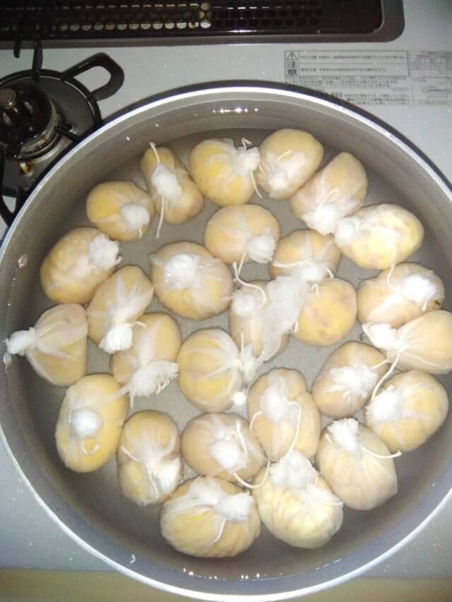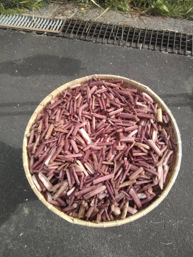 少し干したら皮をむき、塩漬けをして酢や唐辛子で味を付け重石をして漬物にします。