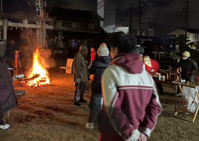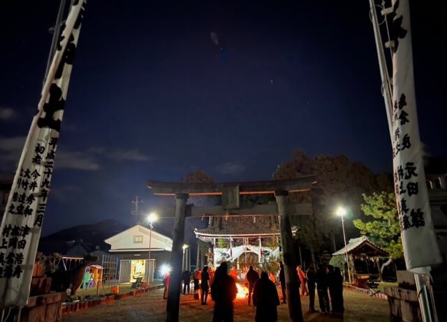 暗闇のお宮の前では焚き火が燃え、パチパチという音と火を囲む方々の姿が幻想的でした。