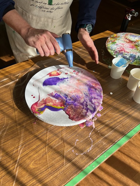 その後、ブロワーで風を送り絵の具をのばしていきます。