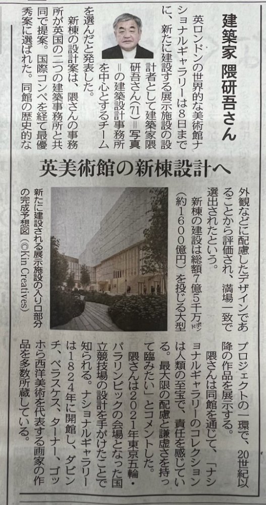 建築家の隈研吾さんがイギリスロンドンのナショナルギャラリーの新設展示施設の設計チームに選ばれたとの記事がありました。