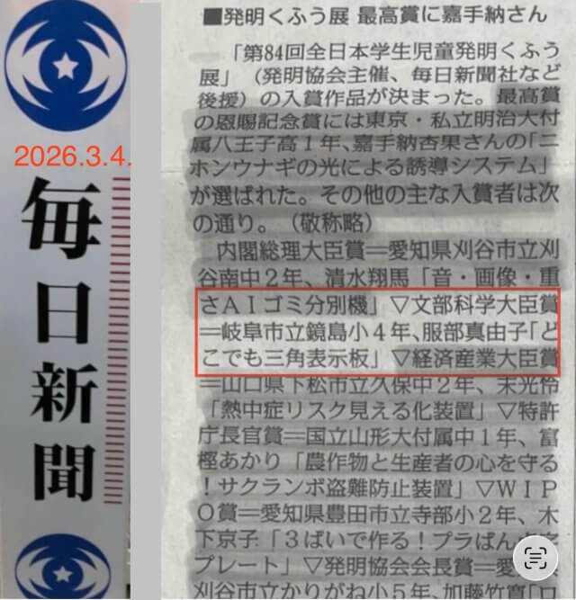 真由子ちゃんの作品が「第84回全日本学生児童発明くふう展」にて「文部科学大臣賞」を受賞しました。