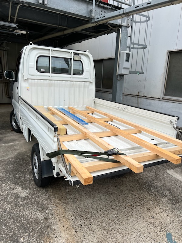 昨日社長が納品の際に4×8の材料がのっていたラックを返却するために軽トラにのせてみたら