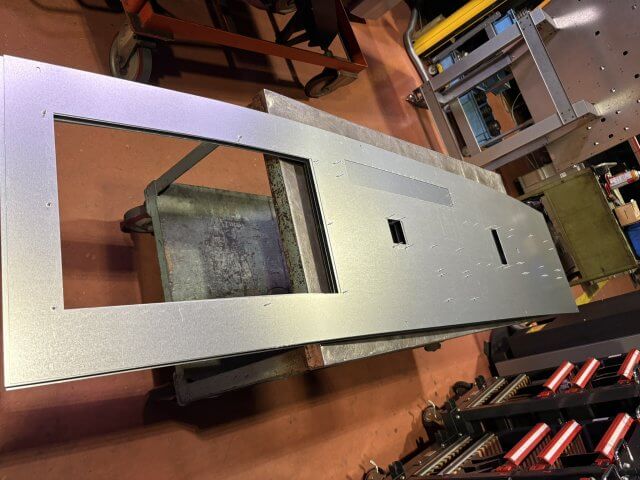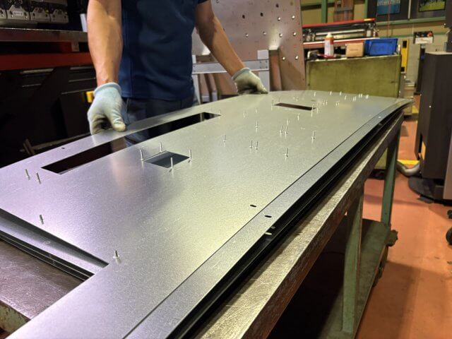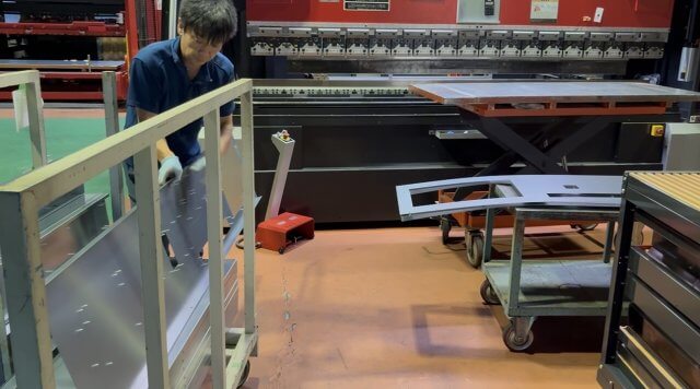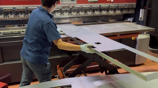 反対側の曲げの為に方向を回転させる時も台車の上でワークを滑らせて方向転換。