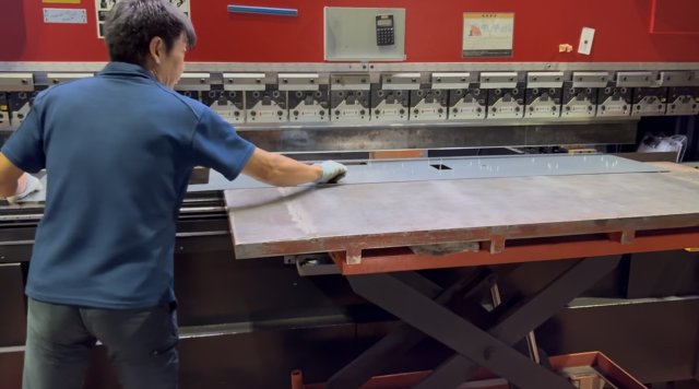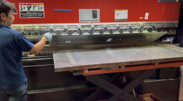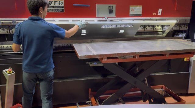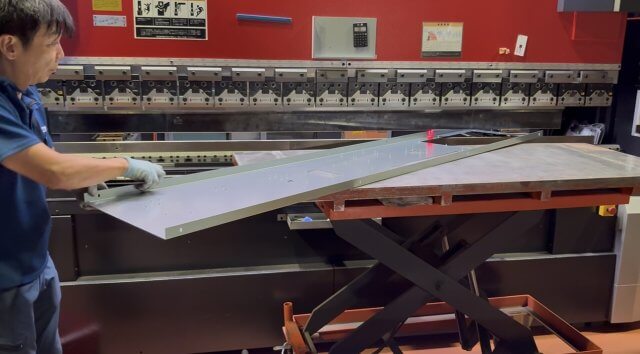 ベンダーの下型と高さを合わせてワークを補助することで一人でも曲げられます。