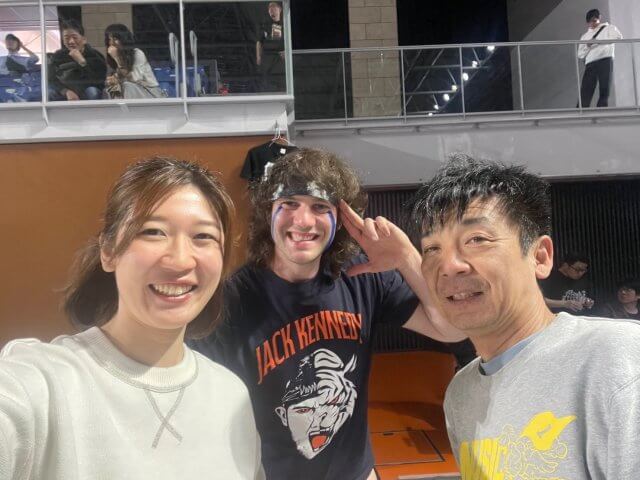 社長と娘は岐阜柳ヶ瀬プロレス所属のジャック・ケネディ選手と記念撮影。